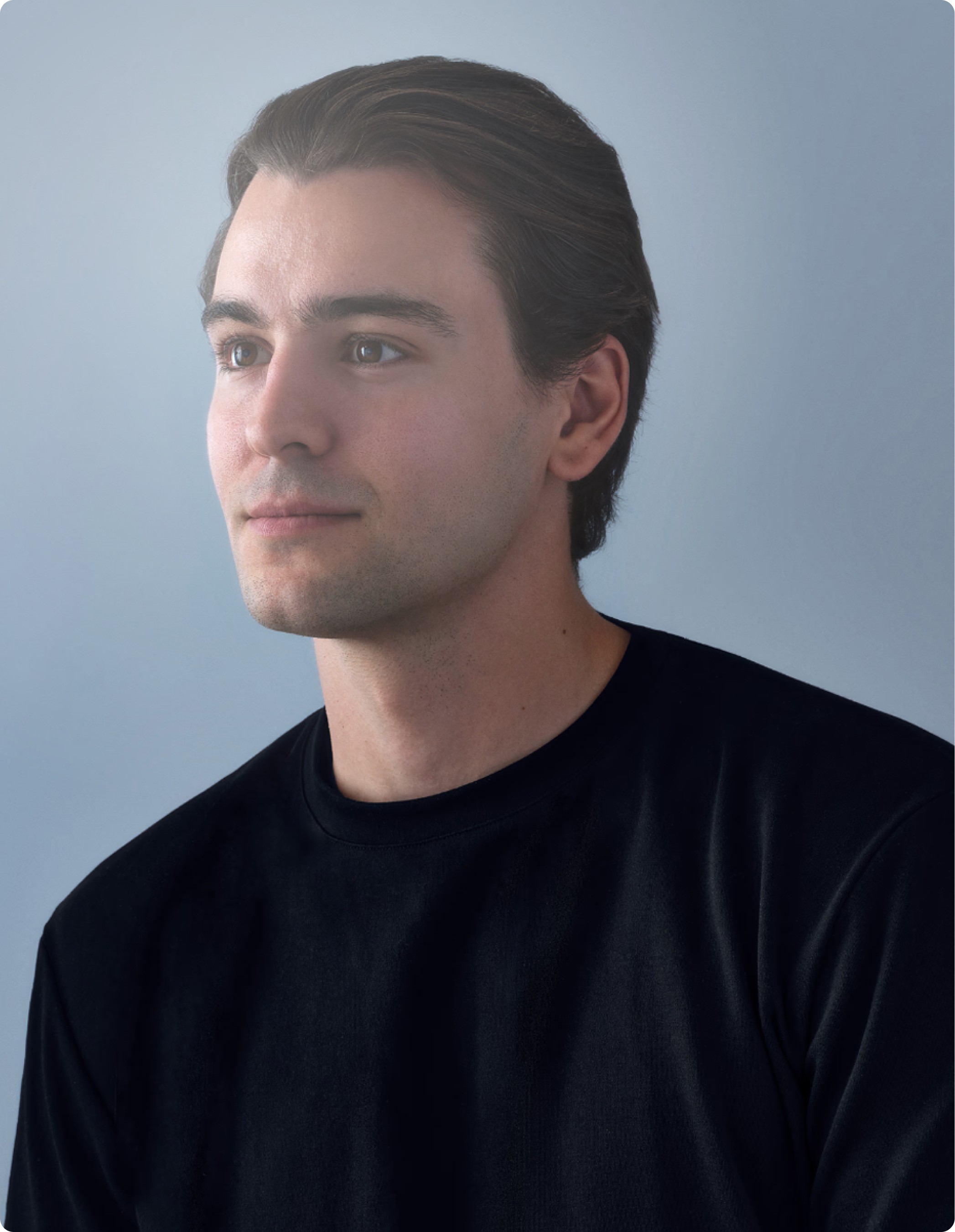 The team portraits and the shpere breathe the same air. Steel-blue gradients wrap both. The result is a visual system where the human and the digital are indistinguishable in tone.