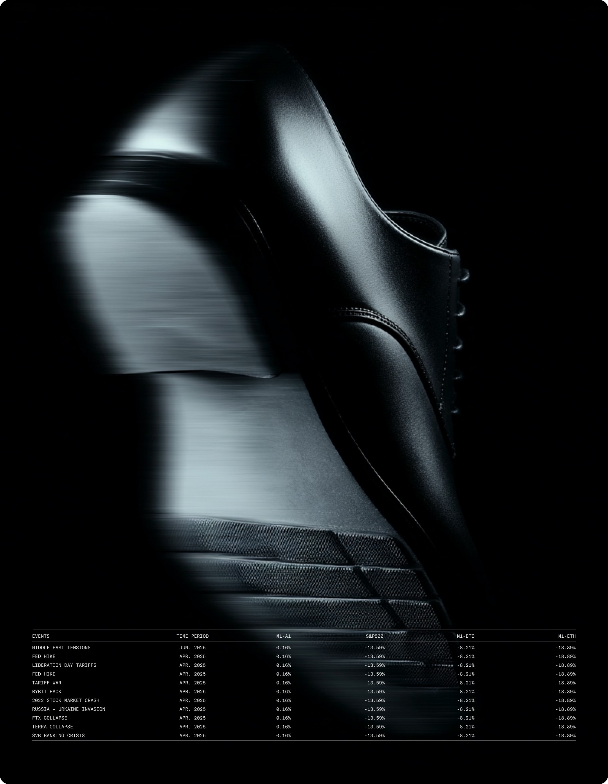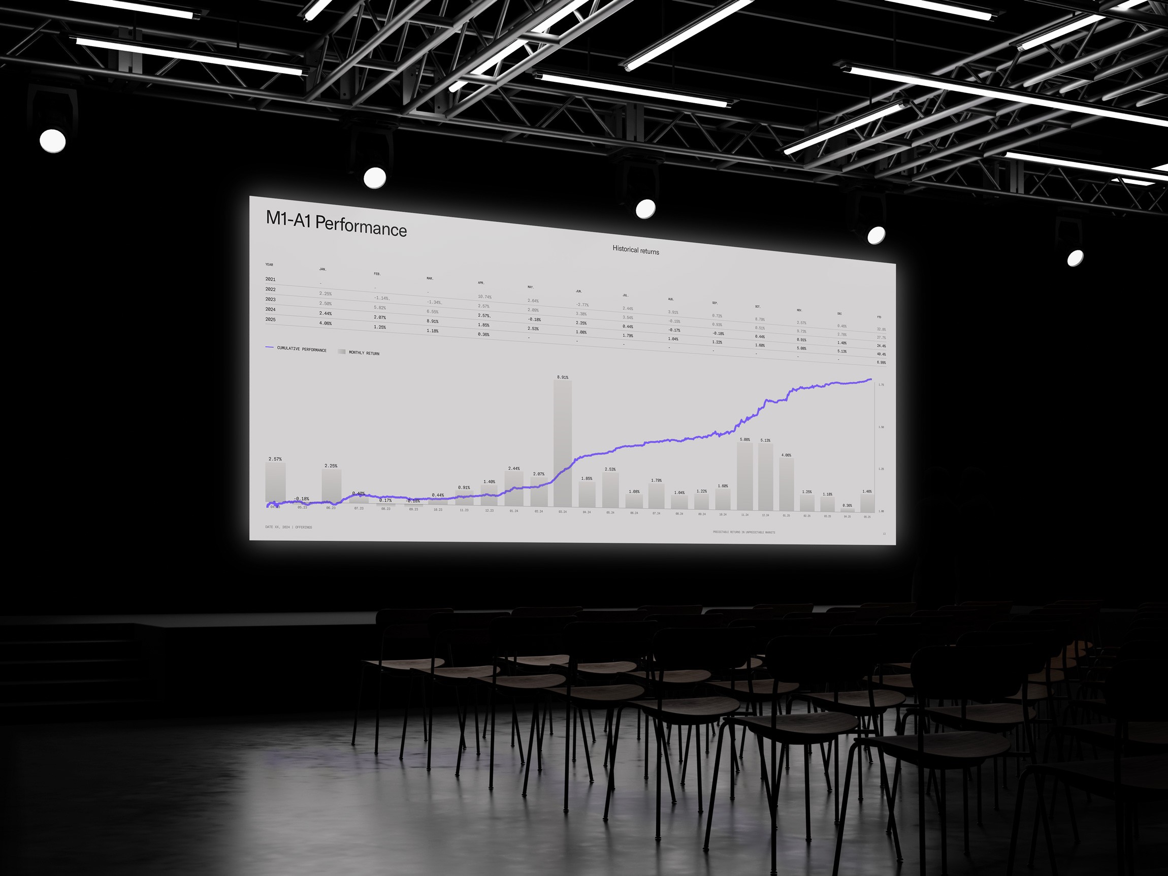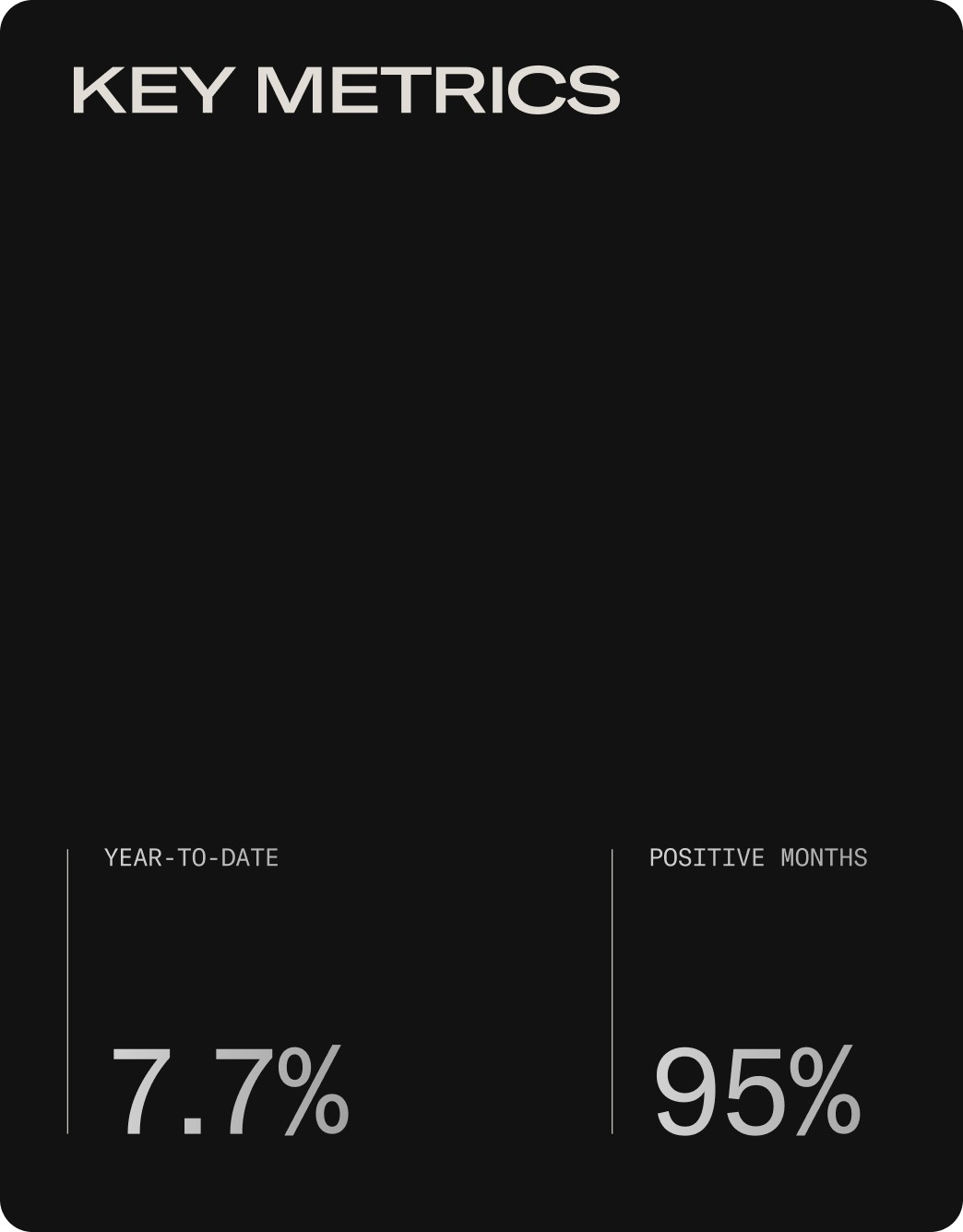 The numbers don't need decoration. YTD returns, annualised performance, positive months, and a Sharpe ratio of 4.0 — each metric is set in mono type, sized for impact, and spaced to breathe.